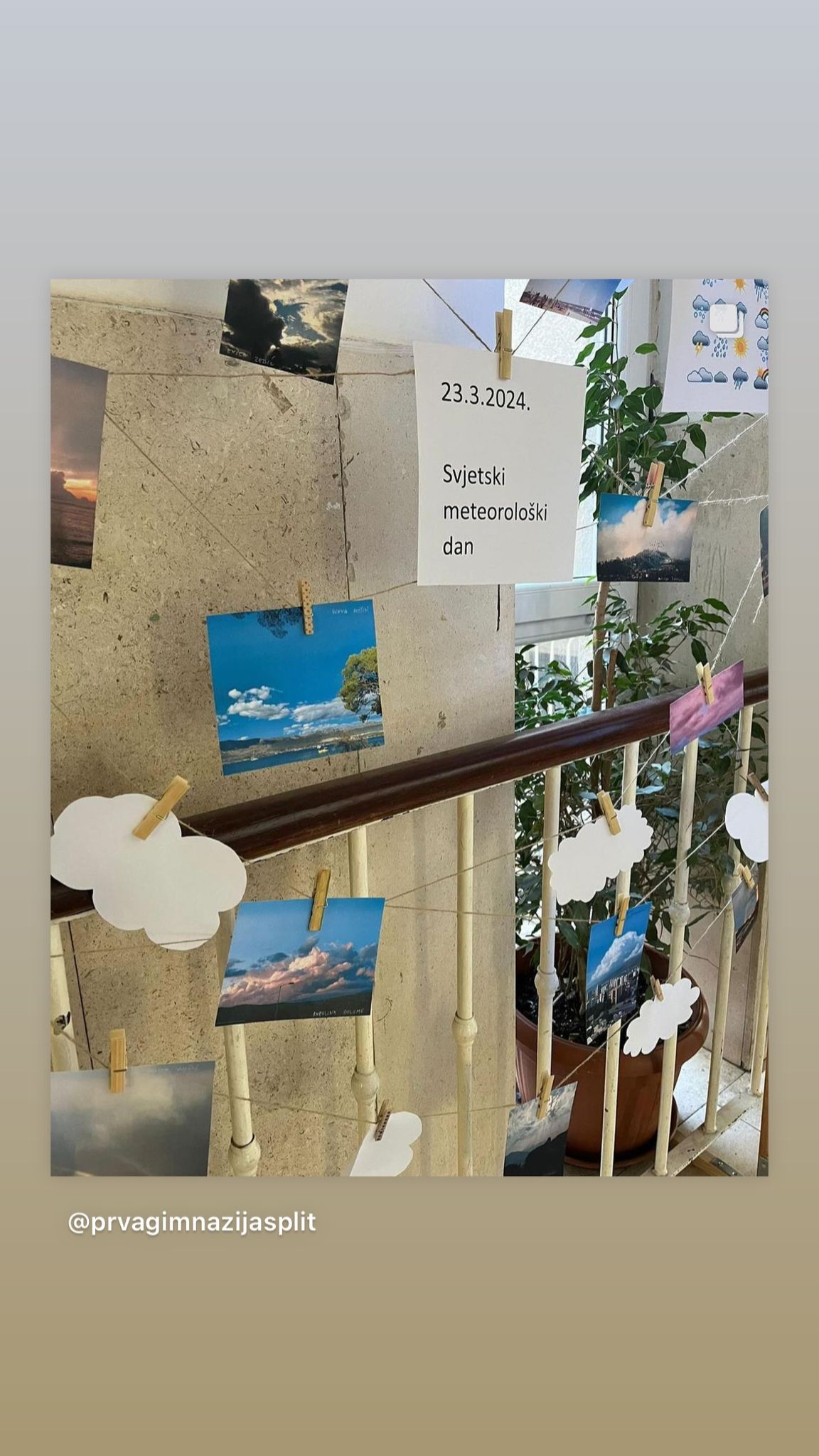 Prva gimnazija Split obilježila je Svjetski meteorološki dan u organizaciji prof. Tine Franić i fotokluba Perspektiva. Učenici su fotografirali meteorološke fenomene i kreirali izložbu fotografija oblaka u školskome atriju. Geografske aktivnosti realizirale su se na satu geografije u dinamičnom kvizu znanja.